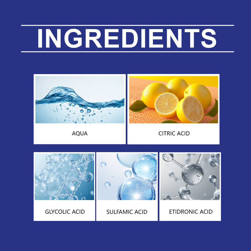 Pääainesosat: Vesi, sitruunahappo, amidosulfonihappo, glykolihappo, hydroksietyylideenidifosfonihappo