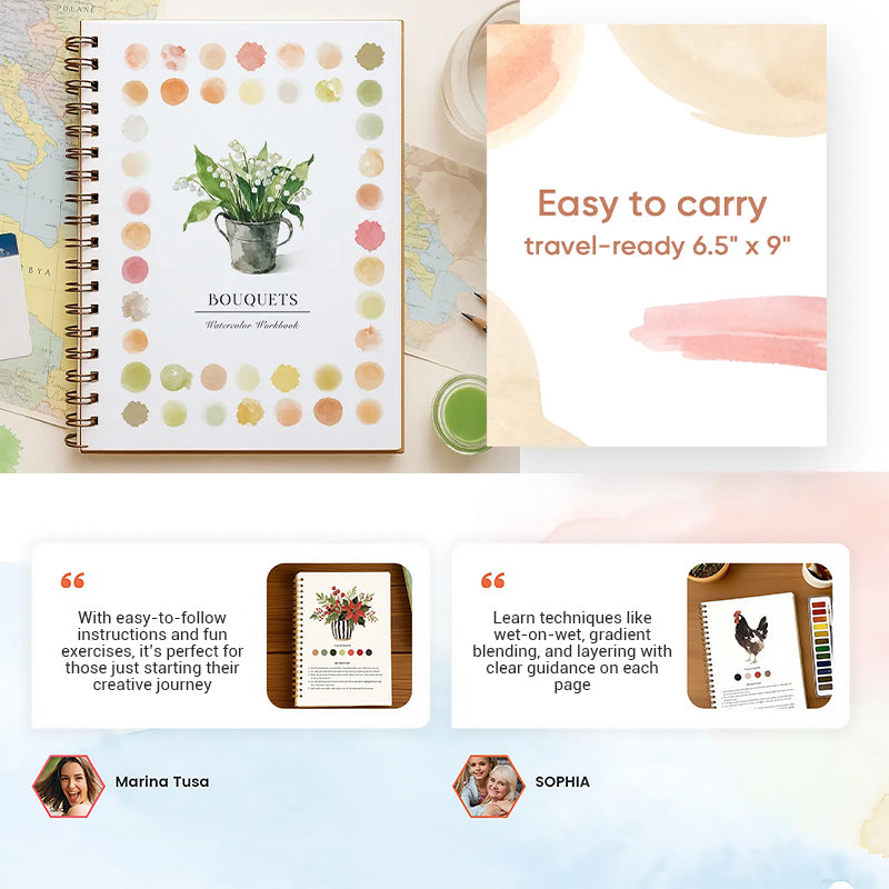 VAIHE VAIHEELTA ETEENPÄIN EDISTÄVÄT OHJEET : Tämä työkirja sisältää yksityiskohtaiset, vaiheittaiset ohjeet, jotka auttavat sinua hallitsemaan vesivärimaalauksen perusteet. Opi tekniikoita, kuten märkää märälle -tekniikkaa, liukuvärejä ja kerrostusta, selkeiden ohjeiden avulla jokaisella sivulla.